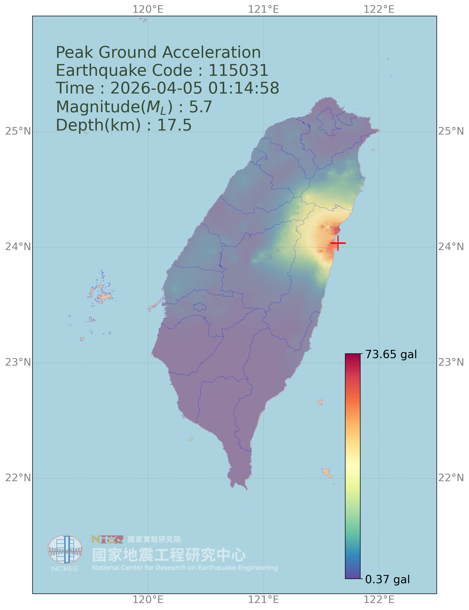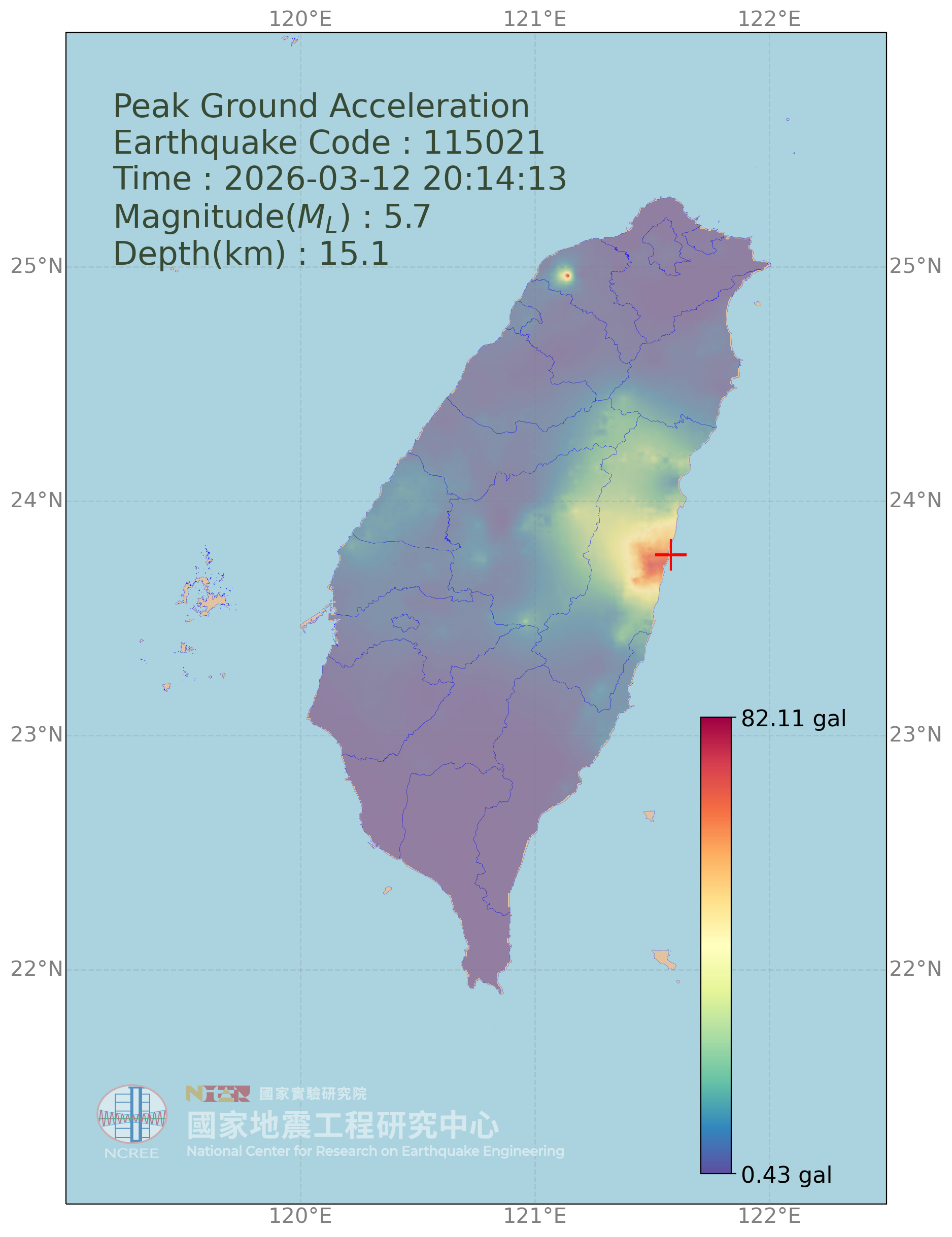 「臺灣地震動分布評估系統」(Taiwan ShakeMap Assessment System)由財團法人國家實驗研究院國家地震工程研究中心所開發及維運,整合本土化之先進地震動預估模型[1, 2]、震源模型、場址參數及空間插值技術,結合中央氣象署與本中心之實測地震觀測數據,開發全自動化高精度地震動推估技術,於地震後立即評估臺灣全島之地震動強度分佈,並透過GIS地理資訊展示介面,建立本系統之網頁服務平台,提供視覺化查詢介面,除作為本中心震後災情評估及救災應變之參考,也供大眾查詢參考。